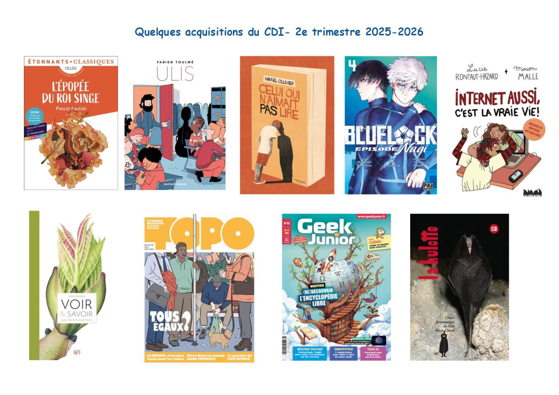 Une nouvelle commande de livres a été reçue en janvier 2026. Le CDI met d’ores et déjà à disposition ces ouvrages, ainsi que les périodiques auxquels le collège est abonné.
